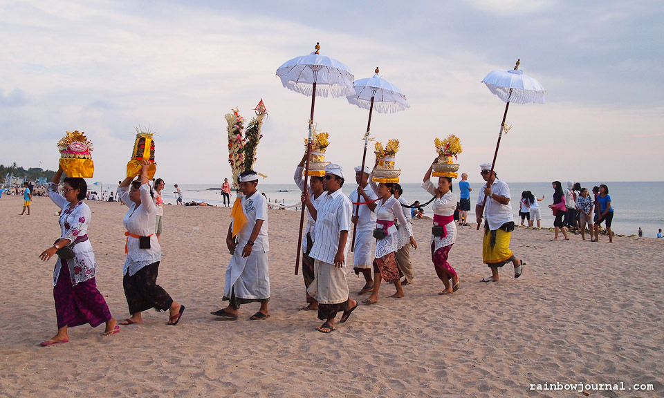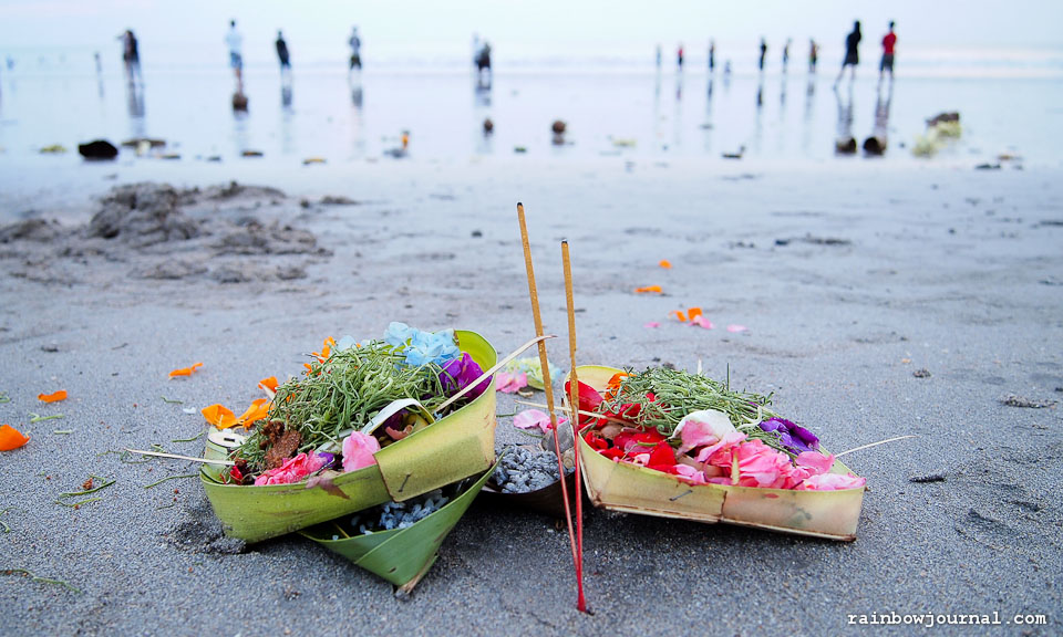 This practice is most evident at the beach, where hundreds of small baskets filled with rice, flowers, candies and biscuits (among other things) are laid on the sand, some of which are eventually carried off to sea by the changing tides.